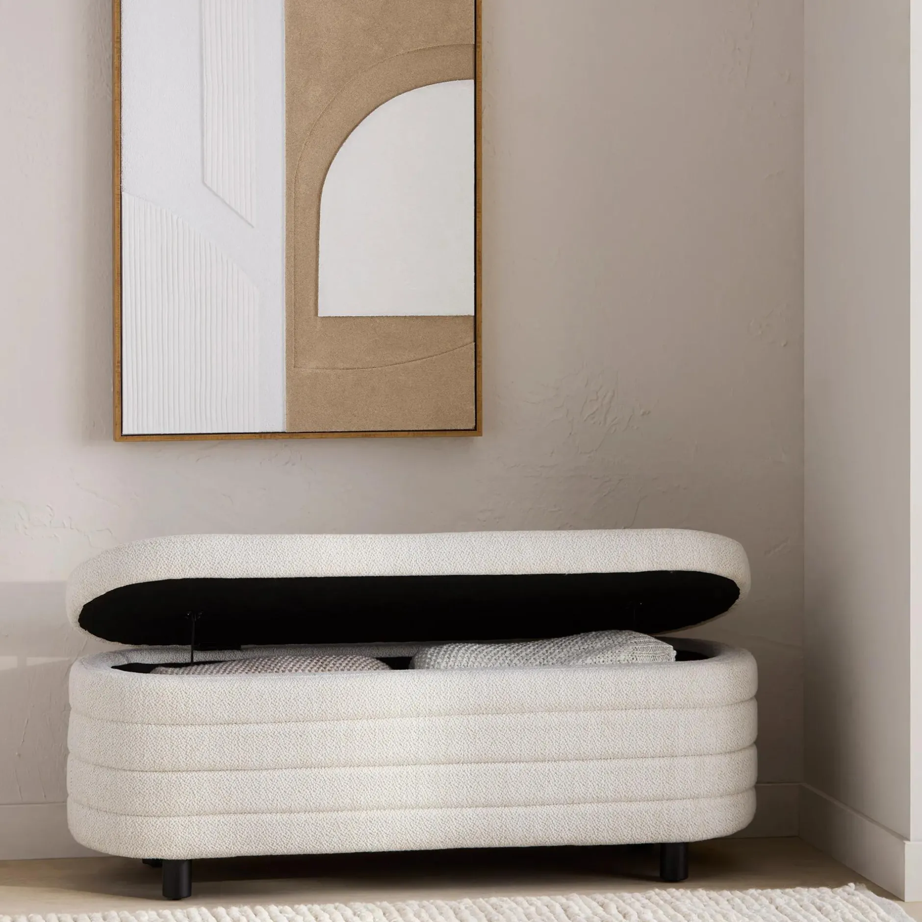 This stylish fabric ottoman with storage combines comfort and practicality. It offers a cozy seating option while providing hidden storage for blankets, shoes, or other essentials. The lift-top design makes accessing your stored items easy, keeping your space neat and organized.