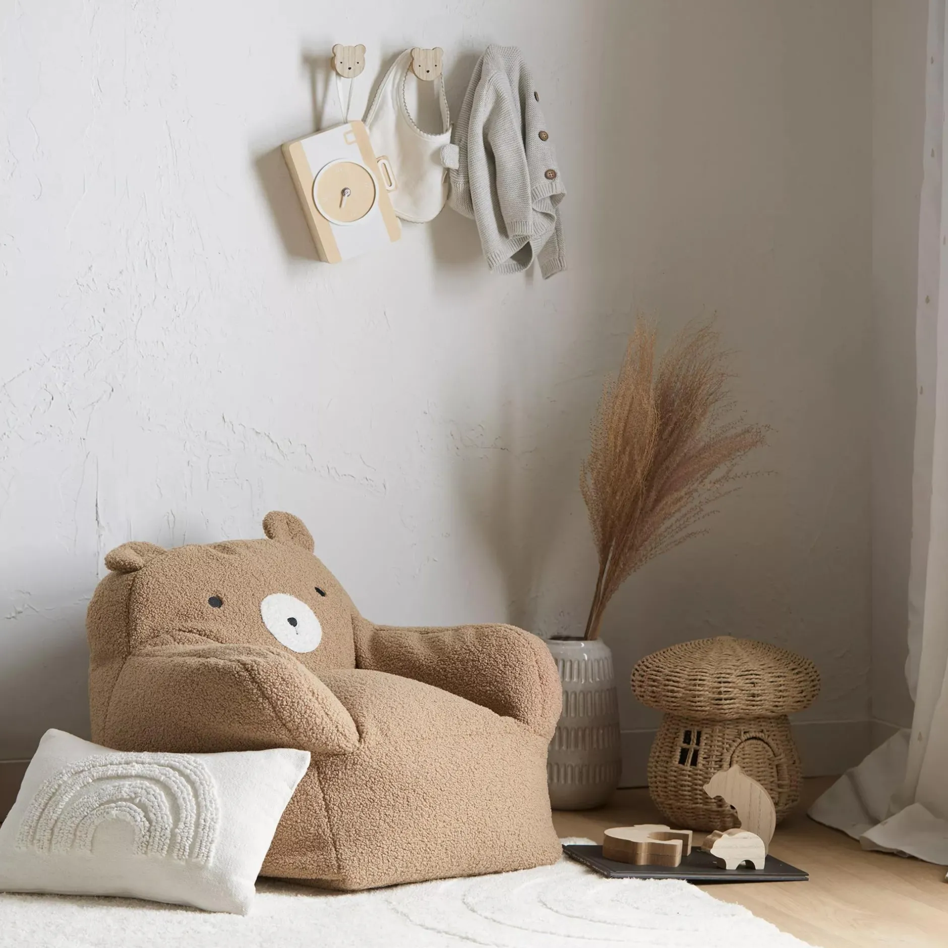 Our sherpa bear chair is covered in plush teddy bear fabric and features the teddy’s gentle face and adorable ears for a cuddly seat for reading and relaxing. With its superior-quality material and lightweight design this kid’s bean-bag-style chair offers a cozy softness and warmth that kids will appreciate.